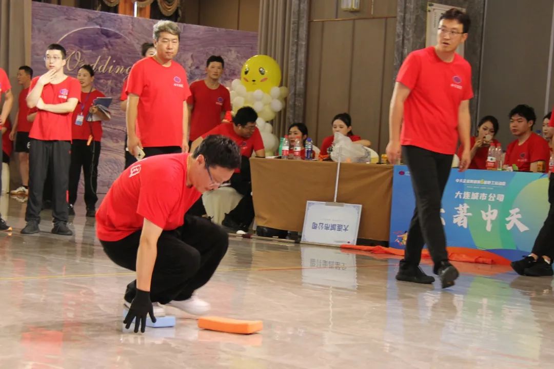“瘋狂毛毛蟲”每隊6人,選手們坐在毛毛蟲上,攜毛毛蟲出發進行折返跑,用時最少為勝。這項運動,主要考驗了隊員們的配合與協調性,只有步調一致才能取得佳績。遼陽城市公司以速度和默契取勝,獲得此項目冠軍,大連城市公司、營口城市公司獲得二、三名。